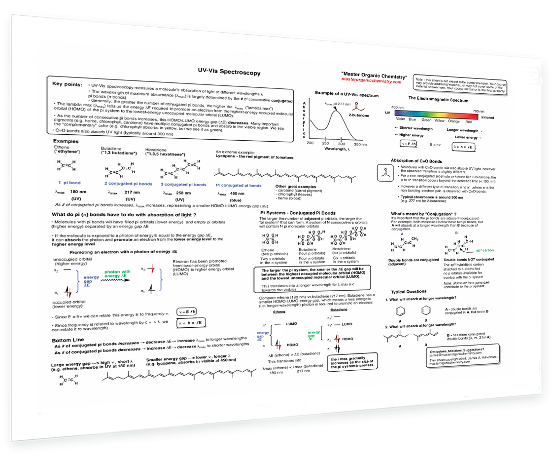 UV light and the HOMO-LUMO gap - The electromagnetic spectrum - Example of a UV-Vis spectrum - Conjugation length vs UV absorbance - Why do pi bonds absorb light? - Effect of conjugation on absorbance - Example of a UV-Vis spectrum - What absorbs at longer wavelength - Absorption of C–O bonds