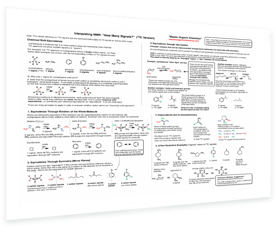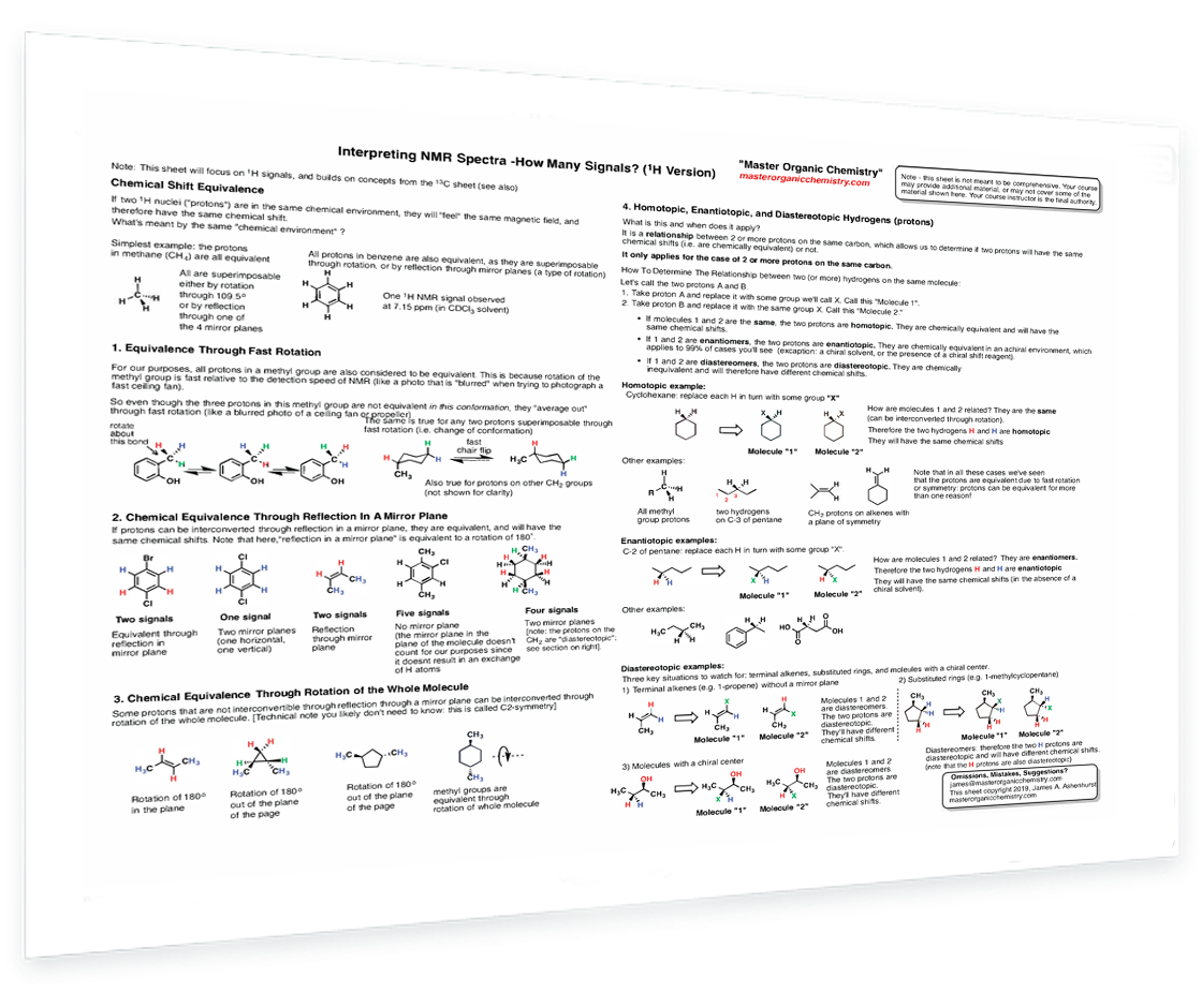 How to figure out "How many signals" questions - Chemical shift equivalence - Equivalence through rotation of the molecule - Equivalence through symmetry (mirror planes) - Fast rotation - Stereochemistry - Homotopic protons