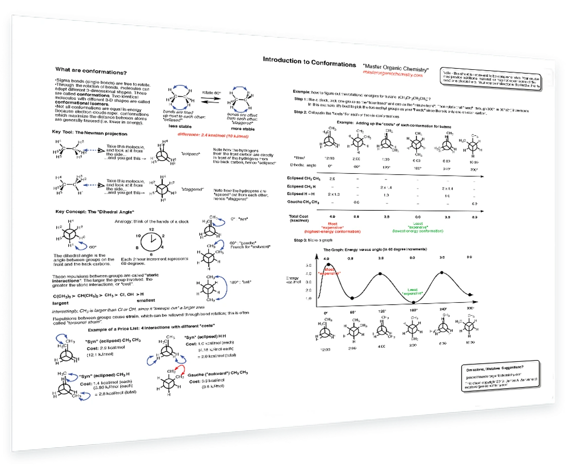 What are conformations – The Newman projection – Staggered and eclipsed – Identifying syn, anti, gauche interactions – Calculating energies of conformations using a “price list” – Mapping out conformation energies on a graph