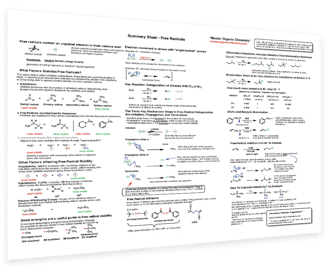 What is a free radical? – 3 key factors that stabilize free radicals –Bond strengths as a guide to radical stability – Showing electron movement with single barbed arrows – Halogenation of alkanes – Recognizing initiation, propagation, termination steps – Identifying free radical initiators – Selectivity of bromine vs chlorine – Allylic and benzyilic bromination – Free radical addition of hbr to alkenes – Calculating selectivity