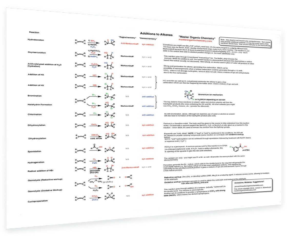 All the key reactions of alkenes on a single page, with notes on their stereochemistry, Markovnikov's rule, possible rearrangements, and more.