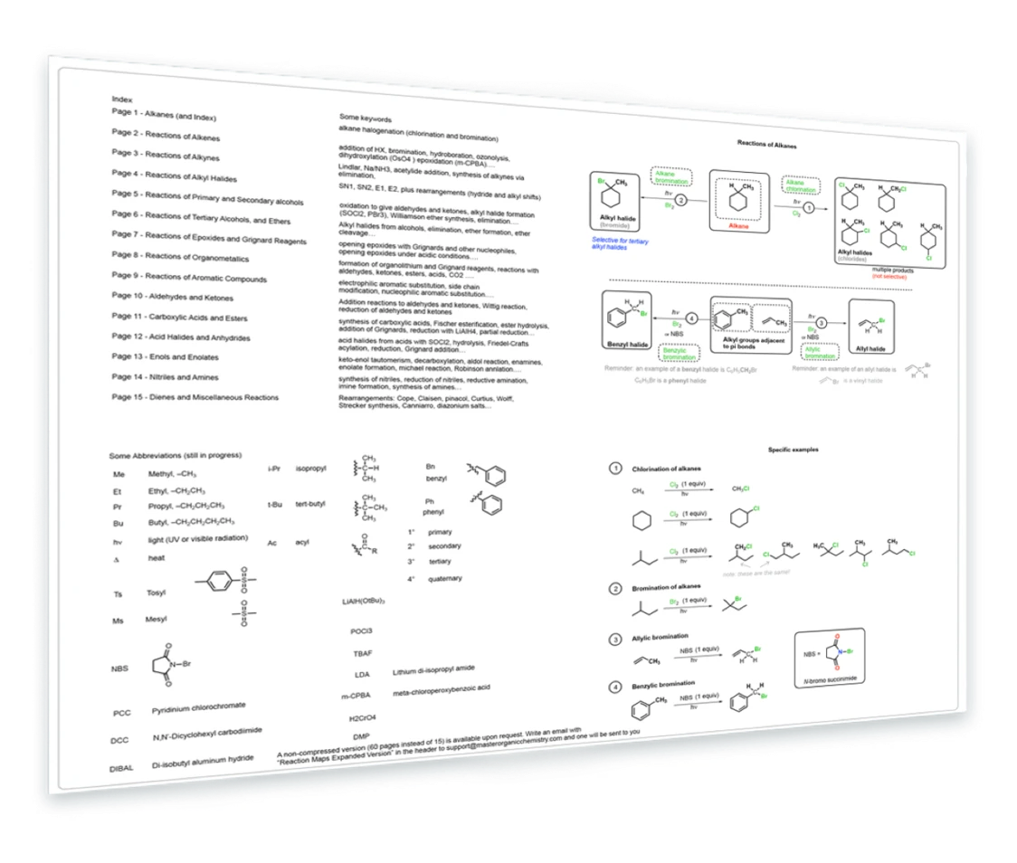 Index - Table of contents - Abbreviations for terms (e.g. Me, Et, Pr, Bu, Bn, Ph) and reagents (e.g. DCC, NBS, PCC, DIBAL, DMP, m-CPBA, etc) - Reactions of alkanes (halogenation) + specific examples