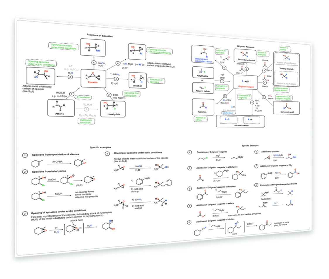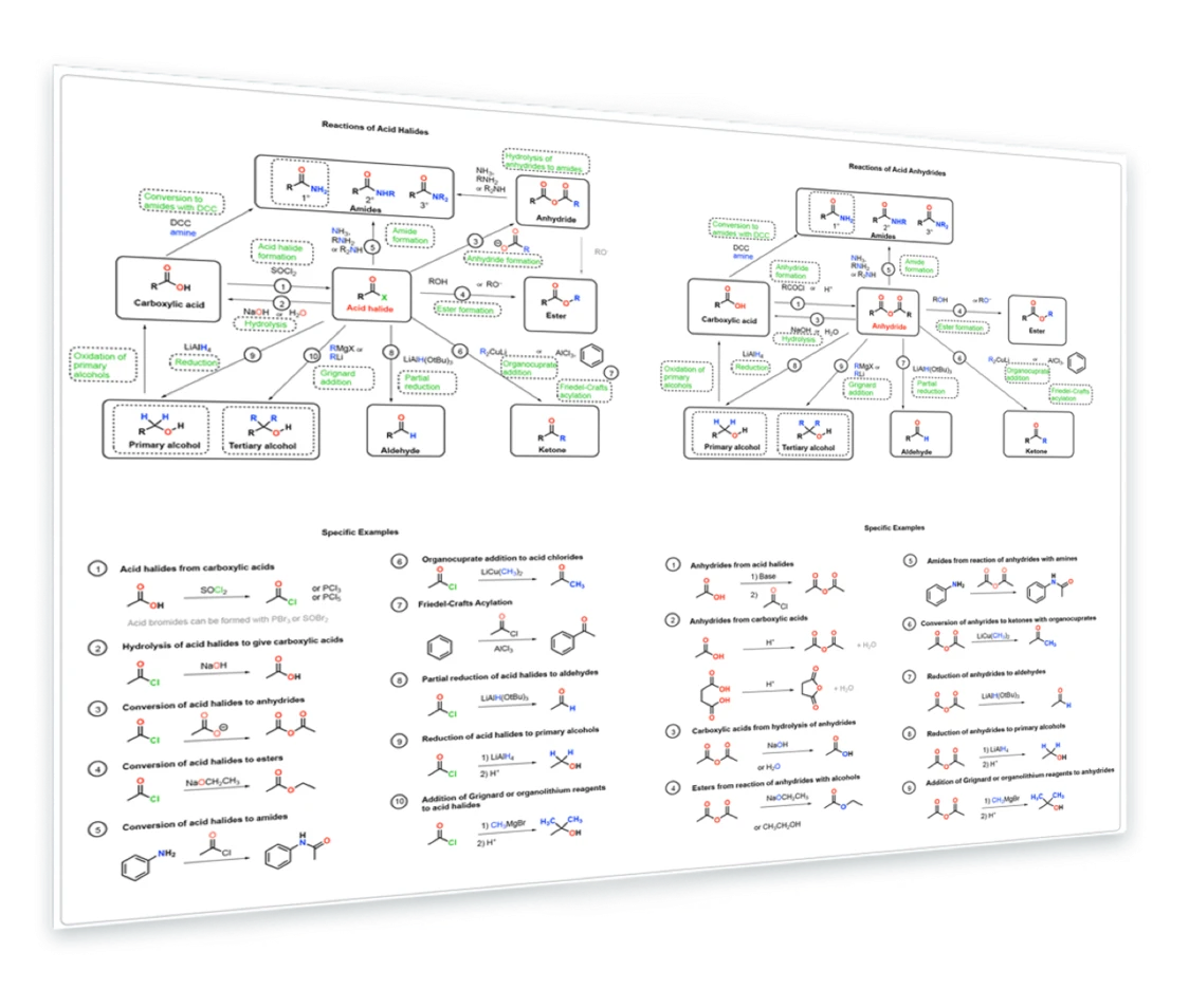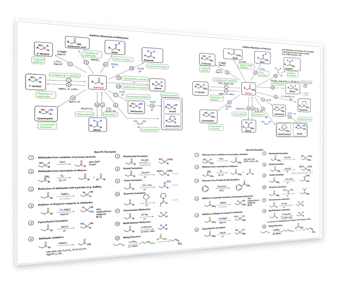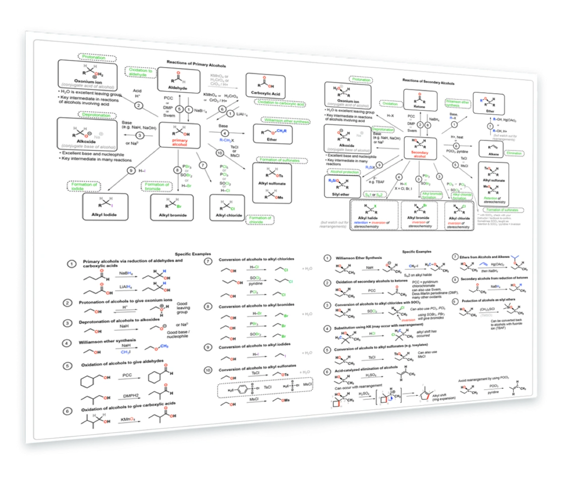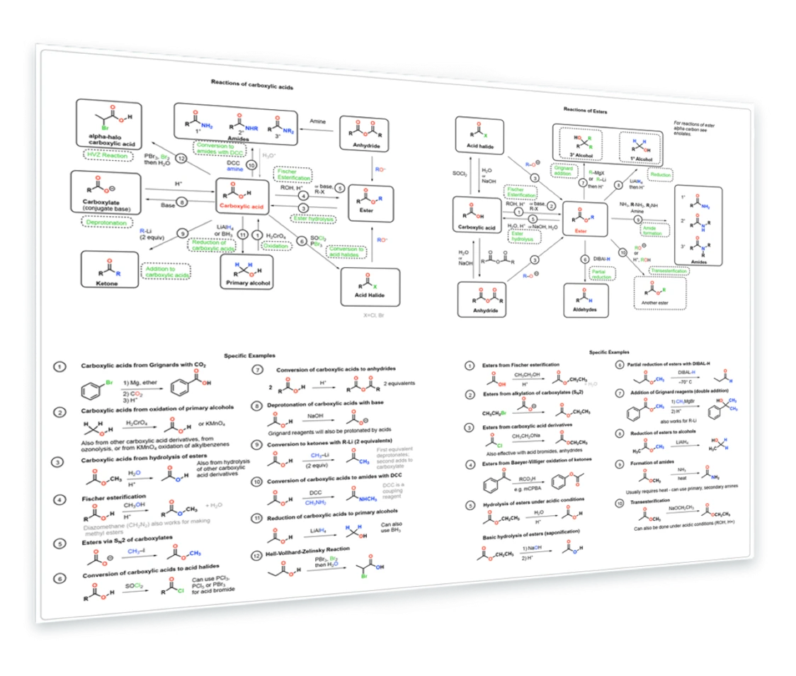 • 15-page PDF (actually 60 pages compressed 50%) with full-color diagrams showing the reactions of each functional group, along with specific examples.
